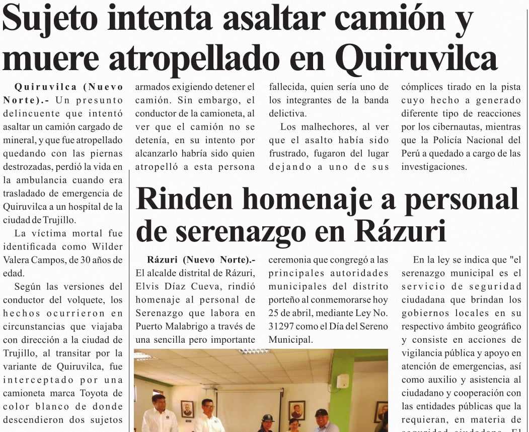 Un presunto ladrón de mineral falleció cuando era trasladado hasta Trujillo. Fue el conductor de un camión cargado de mineral quien informó que al ser interceptado por una camioneta Toyota, de color blanco, a la altura del km 126 de la variante de Quiruvilca, uno de los delincuentes terminó arrollado. (Nuevo Norte, Provincias, Pág.5)
