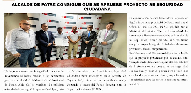 El alcalde provincial de Pataz, Aldo Carlos Mariños, obtuvo luz verde del Ministerio del Interior para modernizar la seguridad ciudadana en Tayabamba, en donde se instalará cámaras de videovigilancia de última generación, central de monitoreo y capacitación del personal, entre las mejoras clave. La iniciativa será financiada y ejecutada a través del Fondo Especial para la Seguridad Ciudadana (FESC). (Radio Karibe Online)(Réplica Noticias Trujillo)(Buenos días, Regional, Pág.8)(Panorama Trujillano, Trujillo, Pág.5)