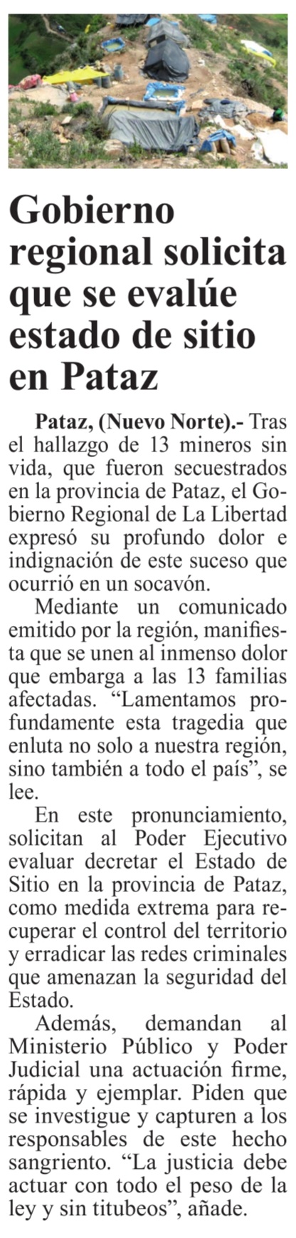 El asesinato de los 13 trabajadores mineros en un socavón en Pataz, región La Libertad, ha provocado la reacción de rechazo generalizado en todo el país, y muchas instituciones han solicitado que el Ejecutivo promueva medidas drásticas para combatir la minería ilegal en la zona. El Gobierno Regional de La Libertad, tras expresar su profundo pesar a los deudos de las víctimas, ha propuesto al Ejecutivo, a través de un comunicado, que evalúe decretar el Estado de Sitio en la provincia de Pataz, como medida extrema, pero necesaria para recuperar el control del territorio y erradicar las redes criminales que amenazan la seguridad del Estado. (Agencia Andina ) ( Perú 21- Pág. Web ) (Nuevo Norte, Provincias, Pág.3)(Satélite, Policial, Pág.5)(Caretas)(Rumbo Minero)(El Búho)(Panamericana)(Exitosa)(RPP)(Sol TV)(Cosmos TV)